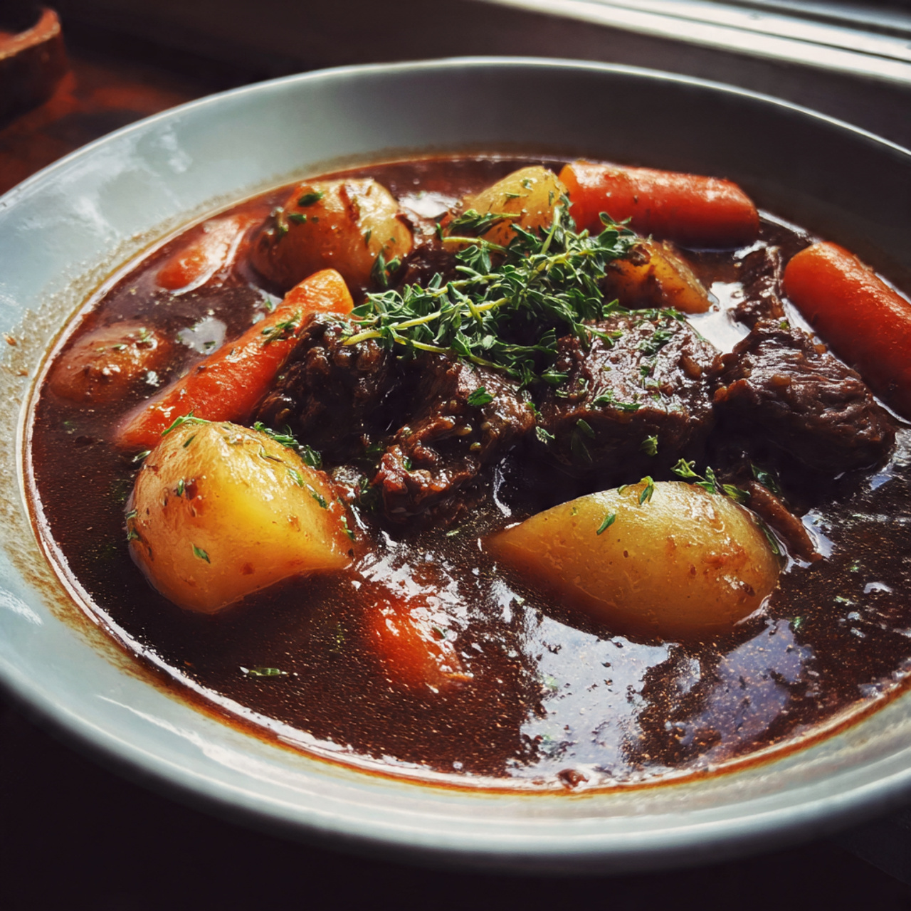 Cover and cook on low heat for 1.5–2 hours until the beef is tender and the stew thickens. - Serve hot:
