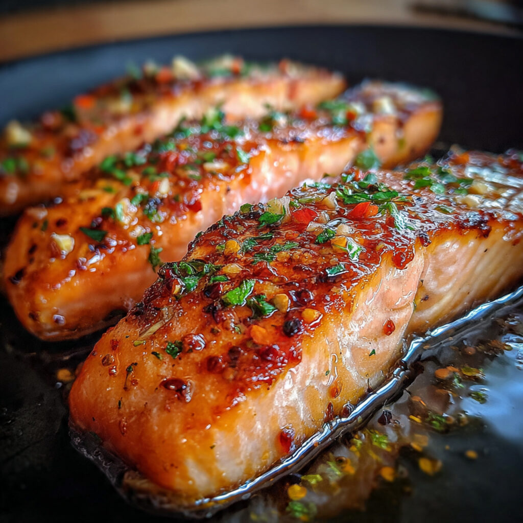 Tilt the pan and spoon the honey butter sauce over the salmon repeatedly for 2–3 minutes. - Finish cooking