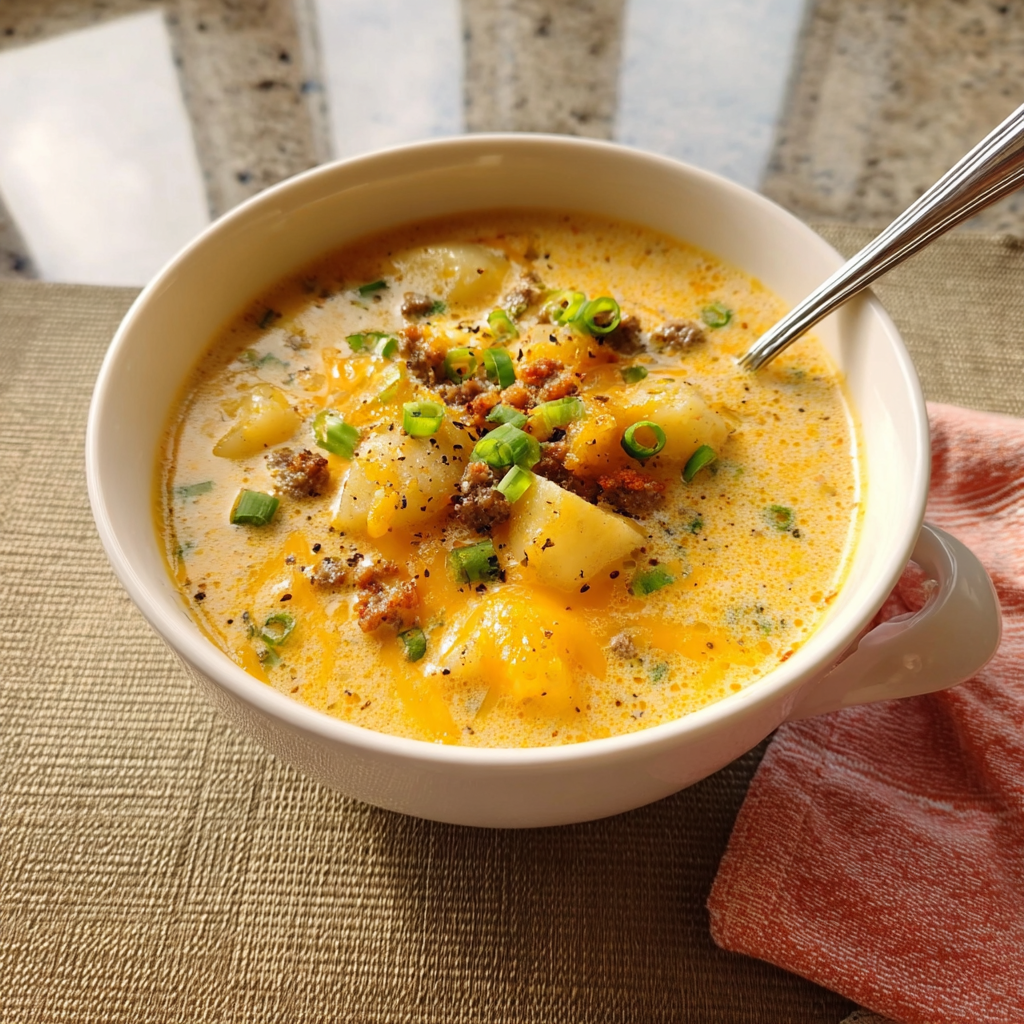 To make a beef potato soup crockpot version, brown the beef first, then add all ingredients except cheese and dairy to the slow cooker. Cook on LOW for 6–7 hours, then stir in cheese and milk at the end.