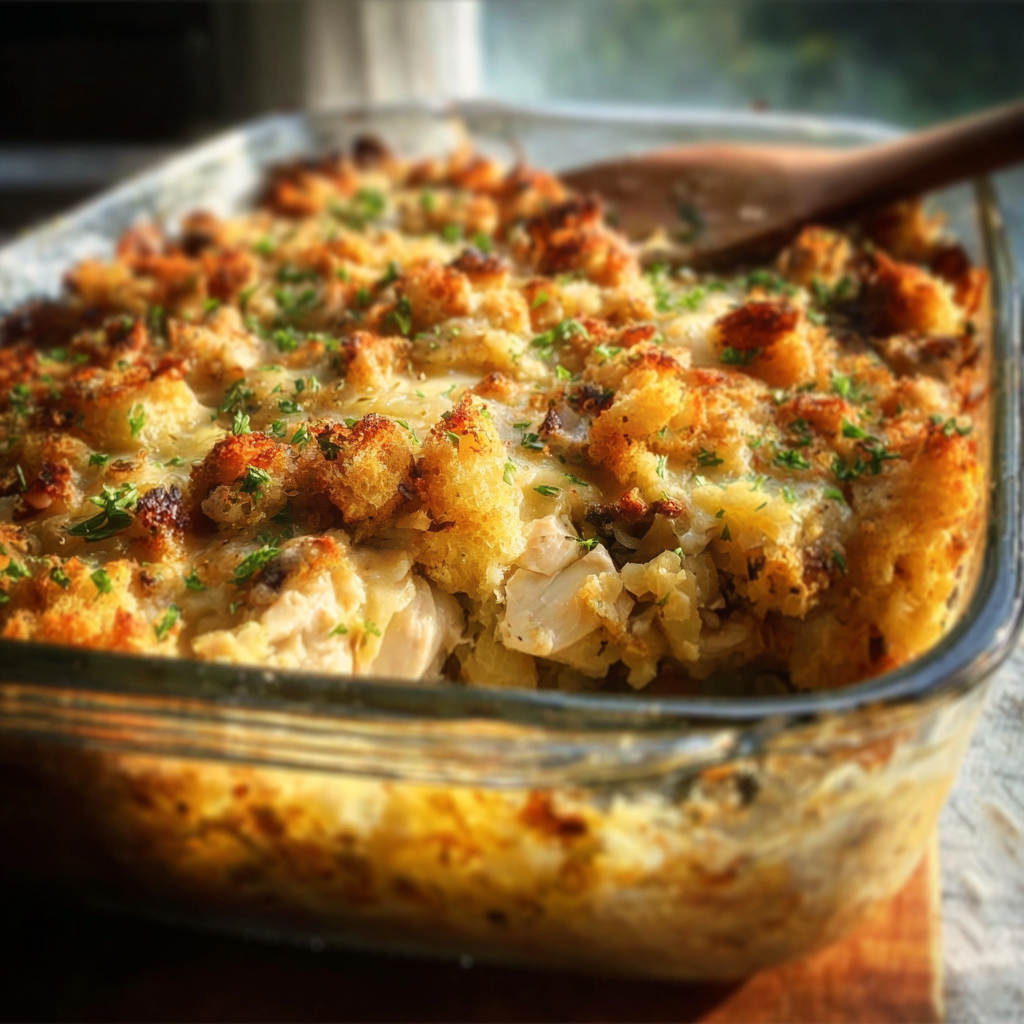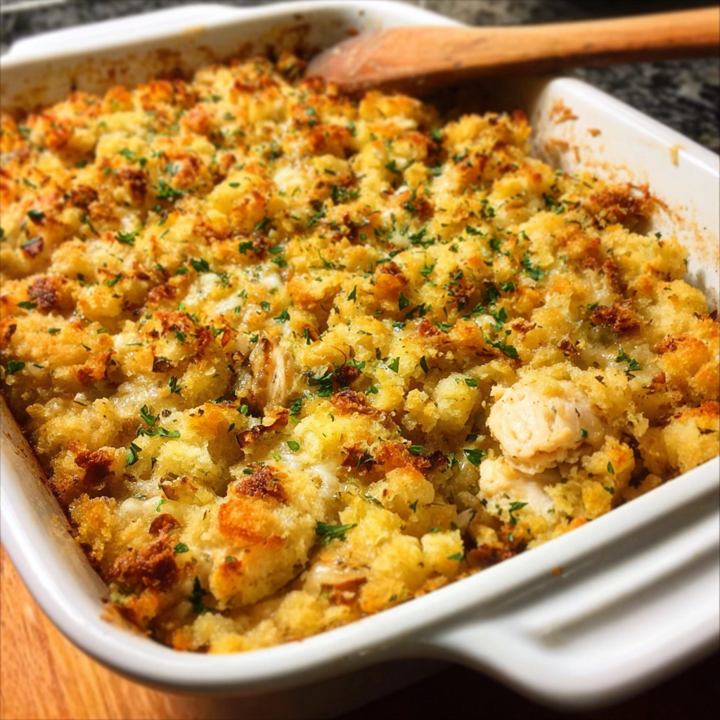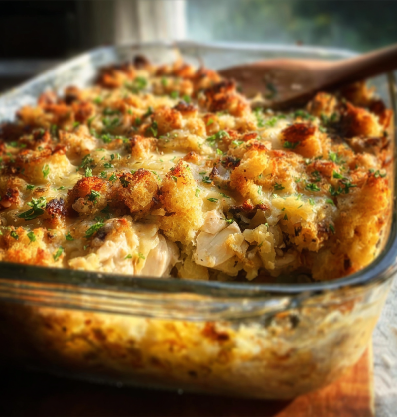 This Chicken And Stove Top Stuffing Casserole comes together in layers: a creamy chicken base, optional vegetables like broccoli, and a golden stuffing topping baked until crispy.