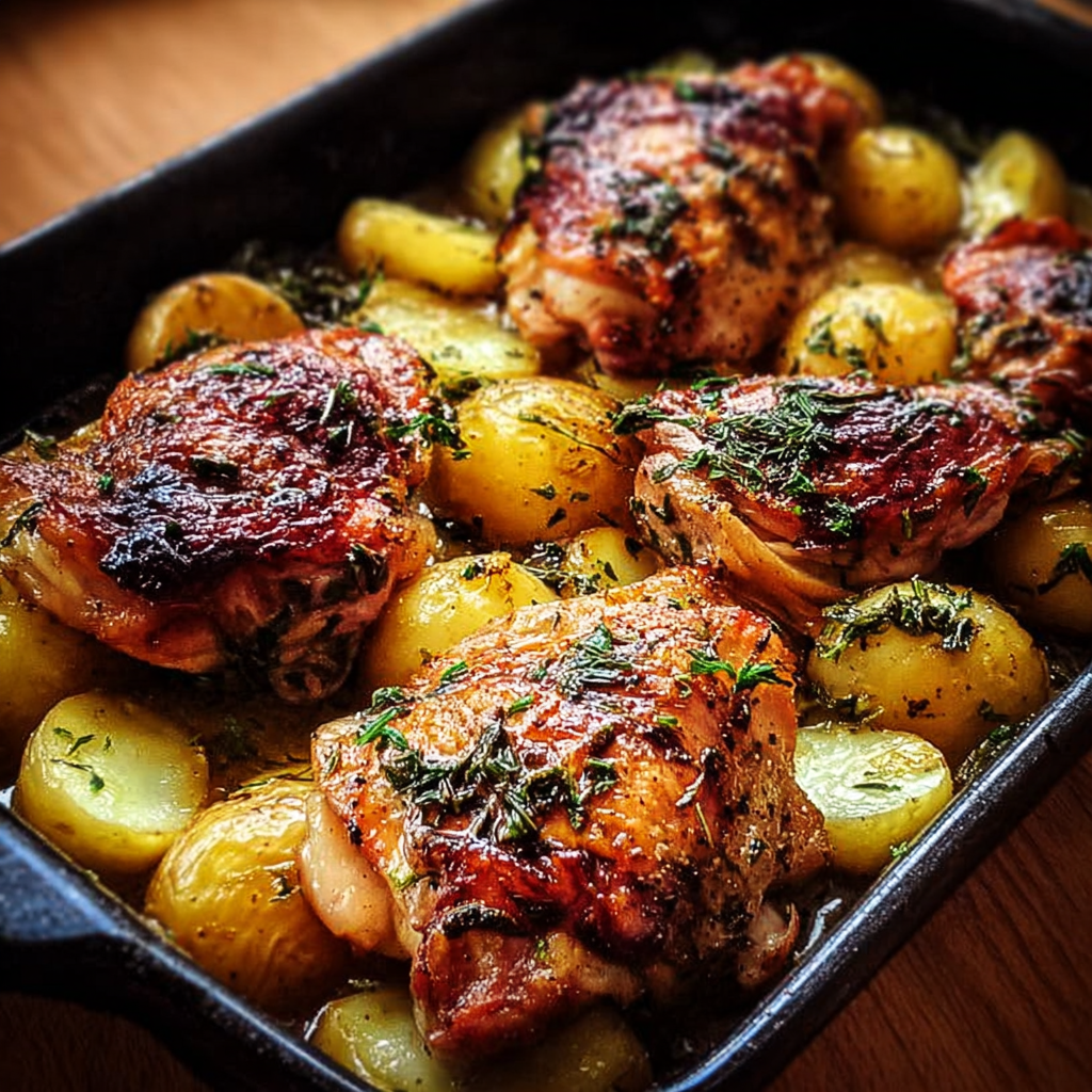 Chicken Thighs and Potatoes is the definition of comfort food made simple. This one pan chicken thigh dinner delivers crispy, juicy chicken and perfectly roasted potatoes in a single baking dish. Itโs ideal for busy families, meal prep, and anyone looking for reliable chicken thighs dinner ideas that donโt require multiple pots and pans.