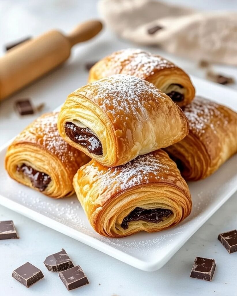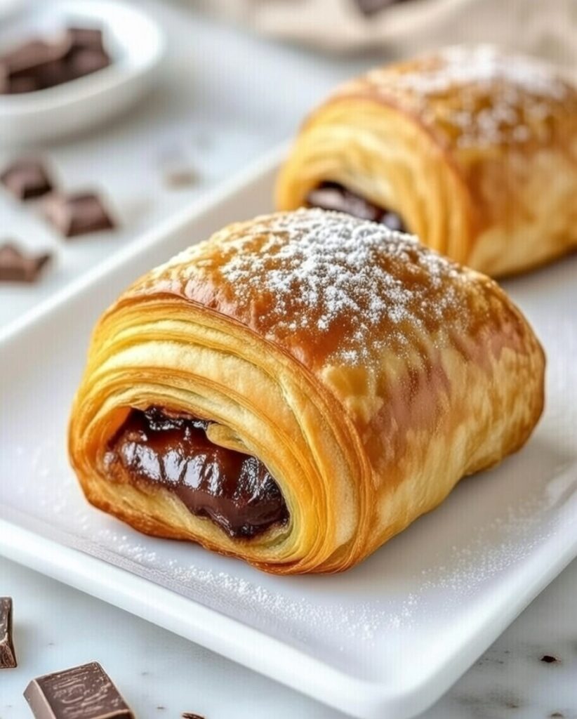 This simplified method uses puff pastry to mimic traditional laminated dough. The pastry is cut, filled with chocolate, rolled, and baked until golden and crisp.