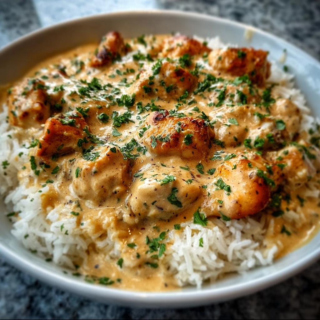 This dish is a true comfort food classic. The chicken is pan-seared until golden, then gently simmered in a creamy gravy until perfectly tender. The rice absorbs all that savory goodness, making every bite rich and satisfying.