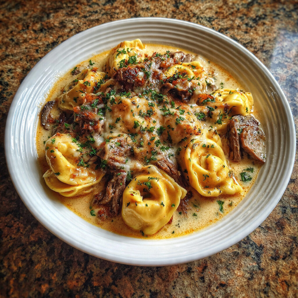 Compared to traditional beef chunks recipes, the addition of creamy tortellini transforms this from a simple meat dish into a full one-pot dinner.
