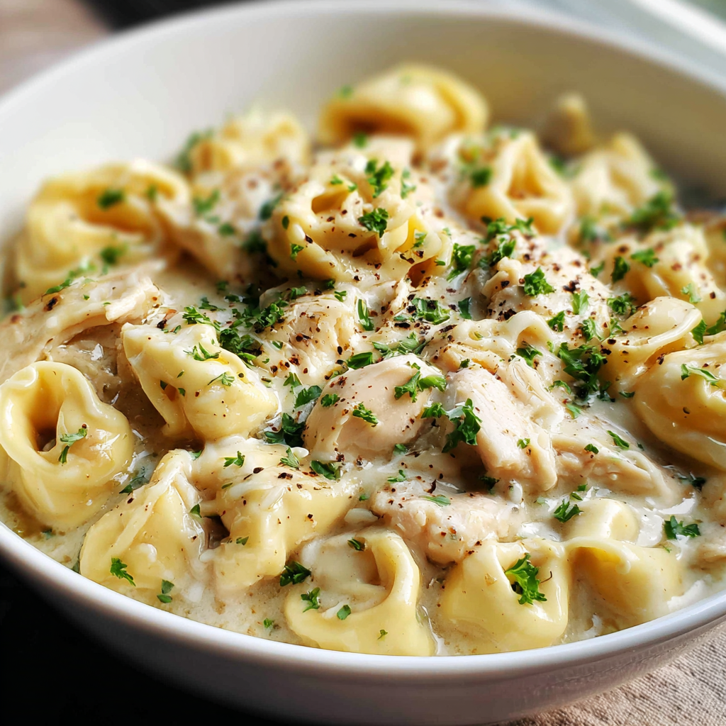 The process begins by placing seasoned chicken into the crockpot along with broth, cream cheese, and seasonings. As the chicken cooks slowly, it becomes tender and easy to shred. The cream cheese melts into the liquid, creating a smooth, creamy sauce base. Near the end of cooking, cheese tortellini is added so it cooks gently in the sauce without becoming mushy. The result is a perfectly balanced, creamy pasta dish made entirely in the slow cooker.