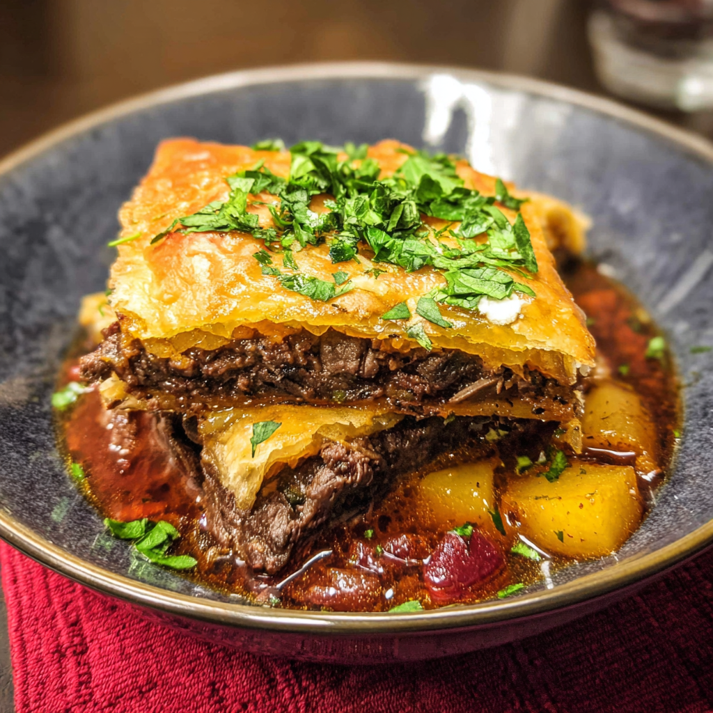 Egyptian Beef Goulash is one of those cozy comfort dishes that feels elegant and rustic at the same time. Unlike the stew-style goulash many people picture, this Egyptian version features layers of buttery phyllo pastry wrapped around a rich, savory beef filling. The result is a crisp golden pie with tender meat inside — perfect for holidays, family gatherings, or a special weeknight dinner.