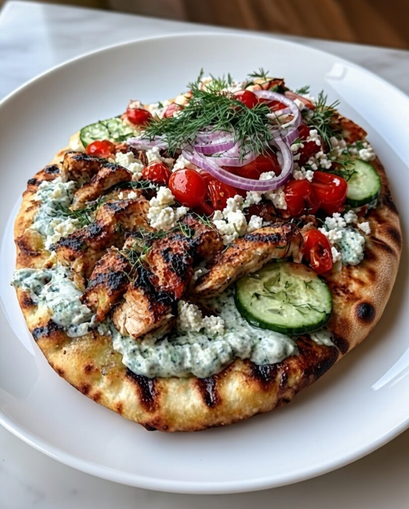 - Spread a generous layer of tzatziki sauce on each flatbread. Add the cooked chicken, then top with cherry tomatoes, cucumber, red onion, and feta cheese.