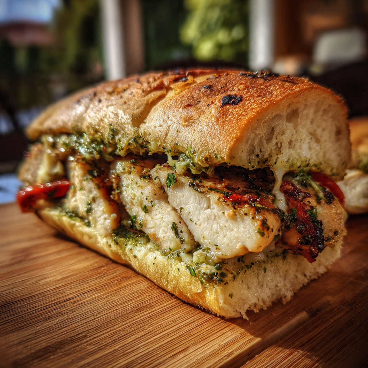 First, the flavor combination is incredible. Fresh basil pesto adds bright herbal notes that pair perfectly with grilled chicken breast and melted cheese. The toasted bread gives the sandwich a crispy exterior while keeping the inside warm and juicy.