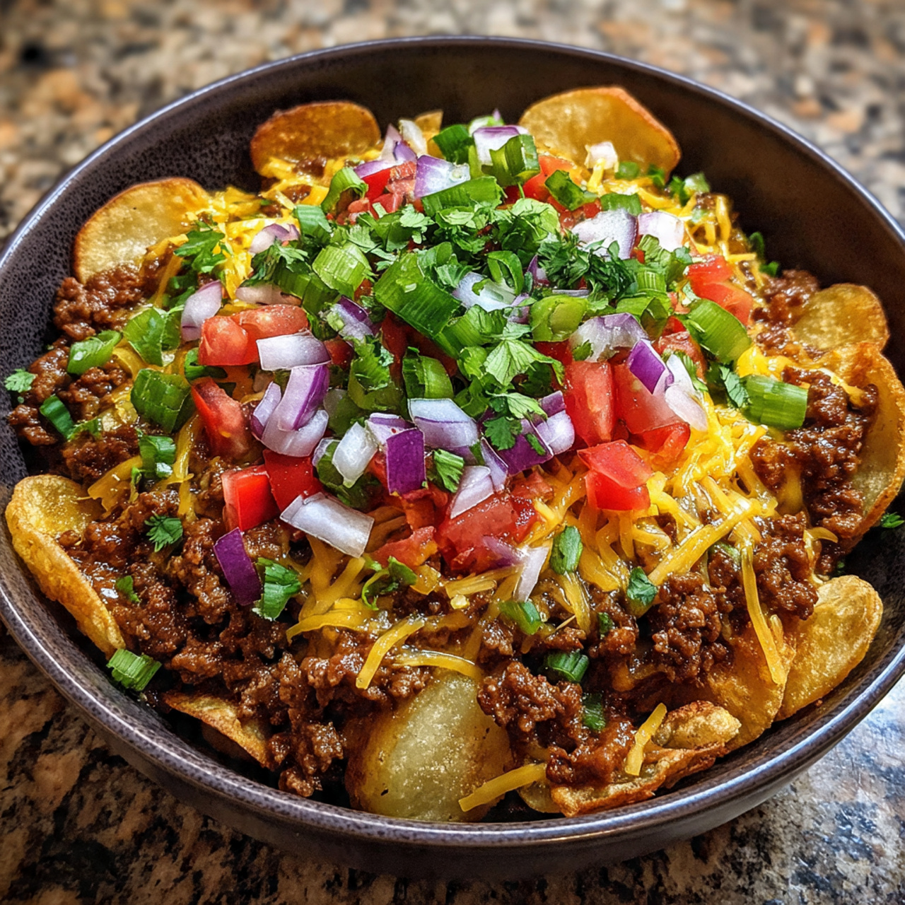 This transforms simple ground beef and potatoes into a colorful, satisfying loaded potato bowl.