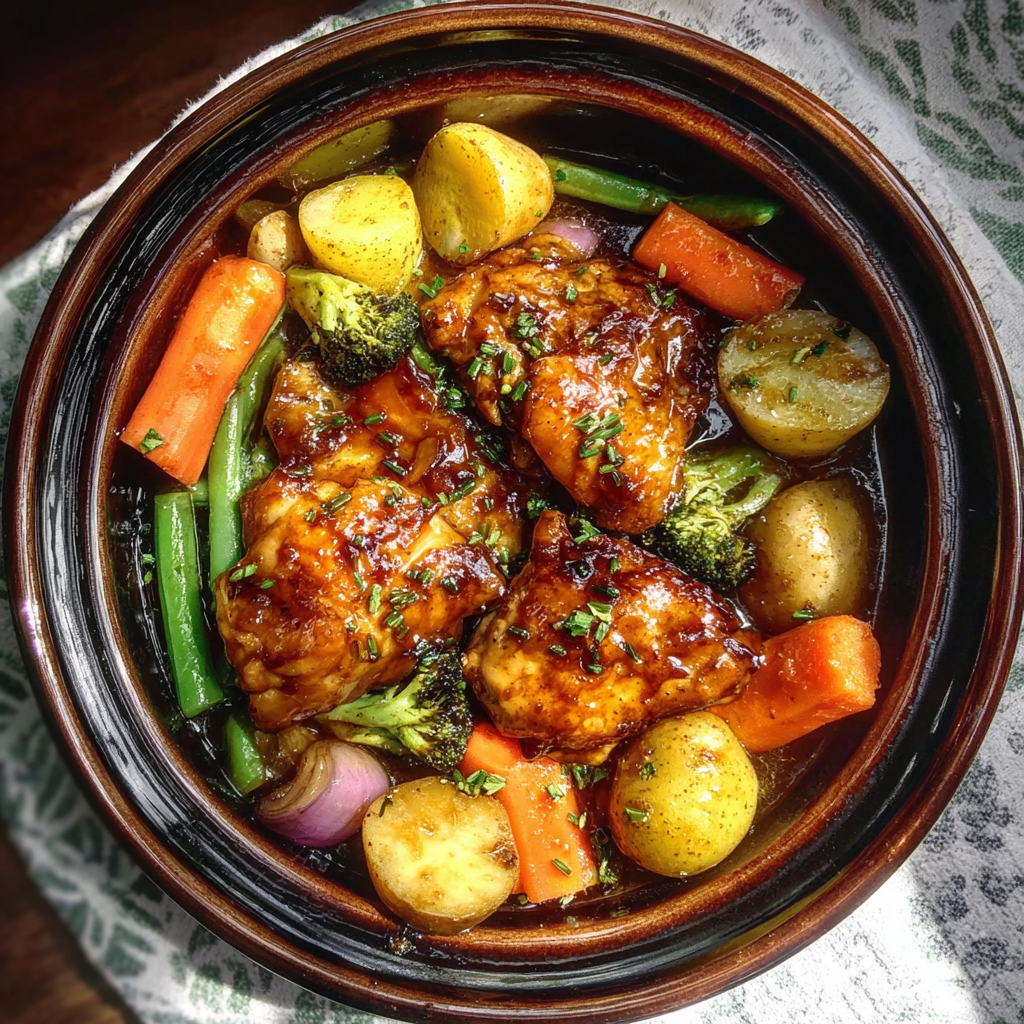 The process is straightforward. The chicken is placed in the slow cooker, then surrounded with fresh vegetables. A simple honey garlic sauce is mixed separately and poured over everything. As it cooks slowly, the sauce infuses the chicken and vegetables with deep flavor. Toward the end of cooking, the dish can be gently stirred to coat everything evenly before serving.