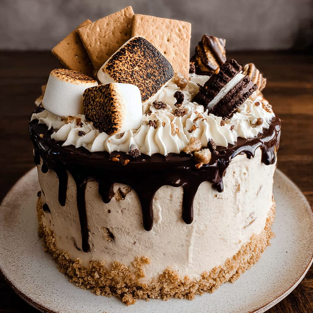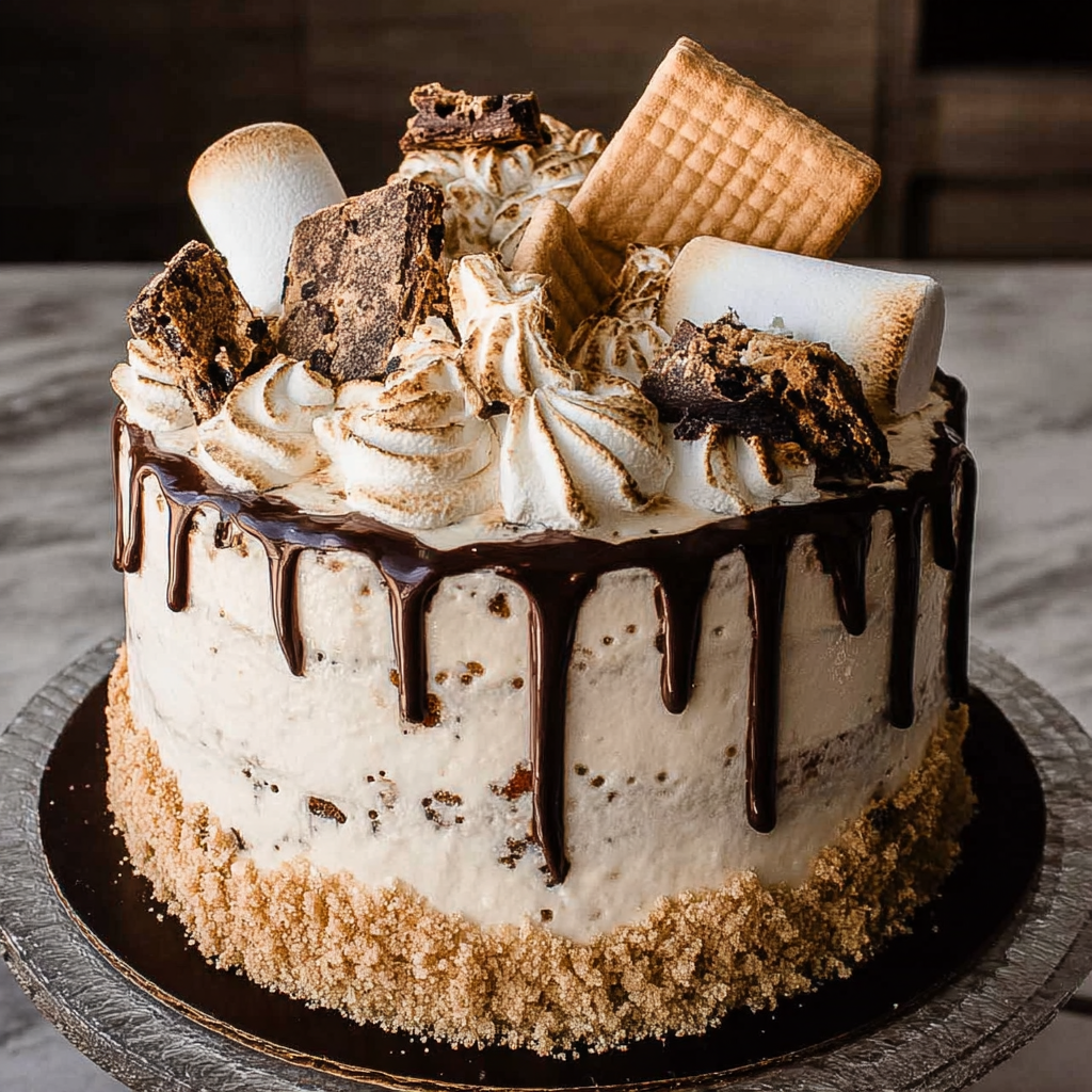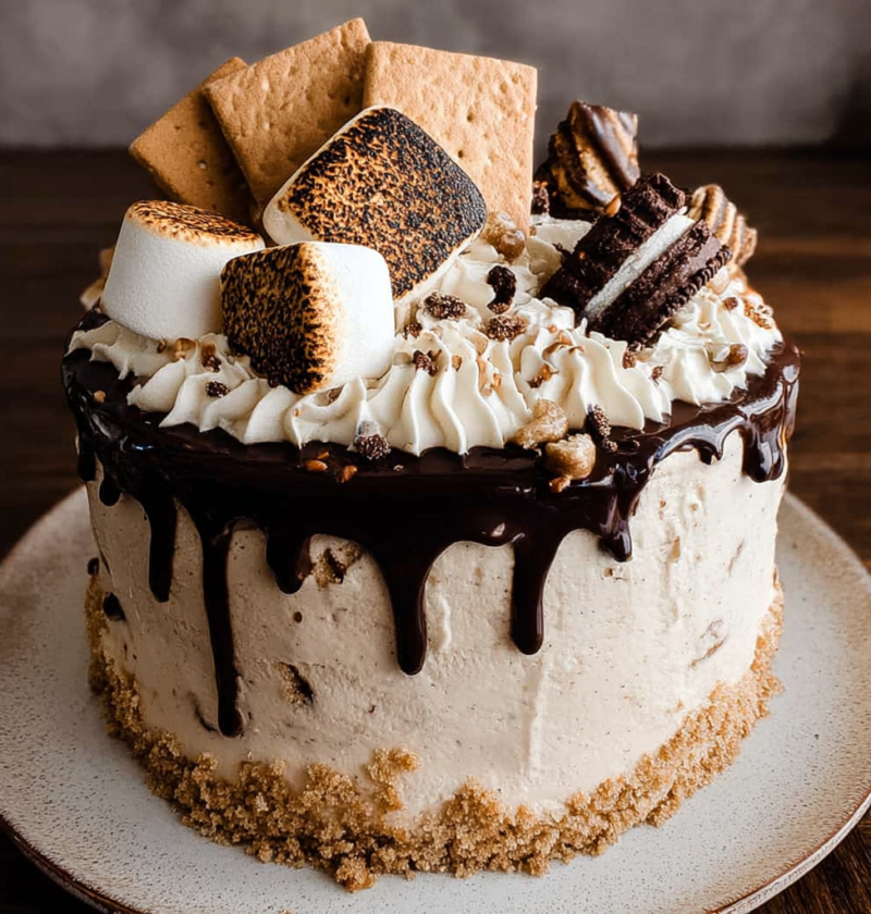 The magic of this S’more Cake comes from layering textures and flavors. You’ll start with a graham cracker crust, add moist chocolate cake layers, fill it with marshmallow frosting, and finish with glossy chocolate ganache and toasted marshmallows on top.