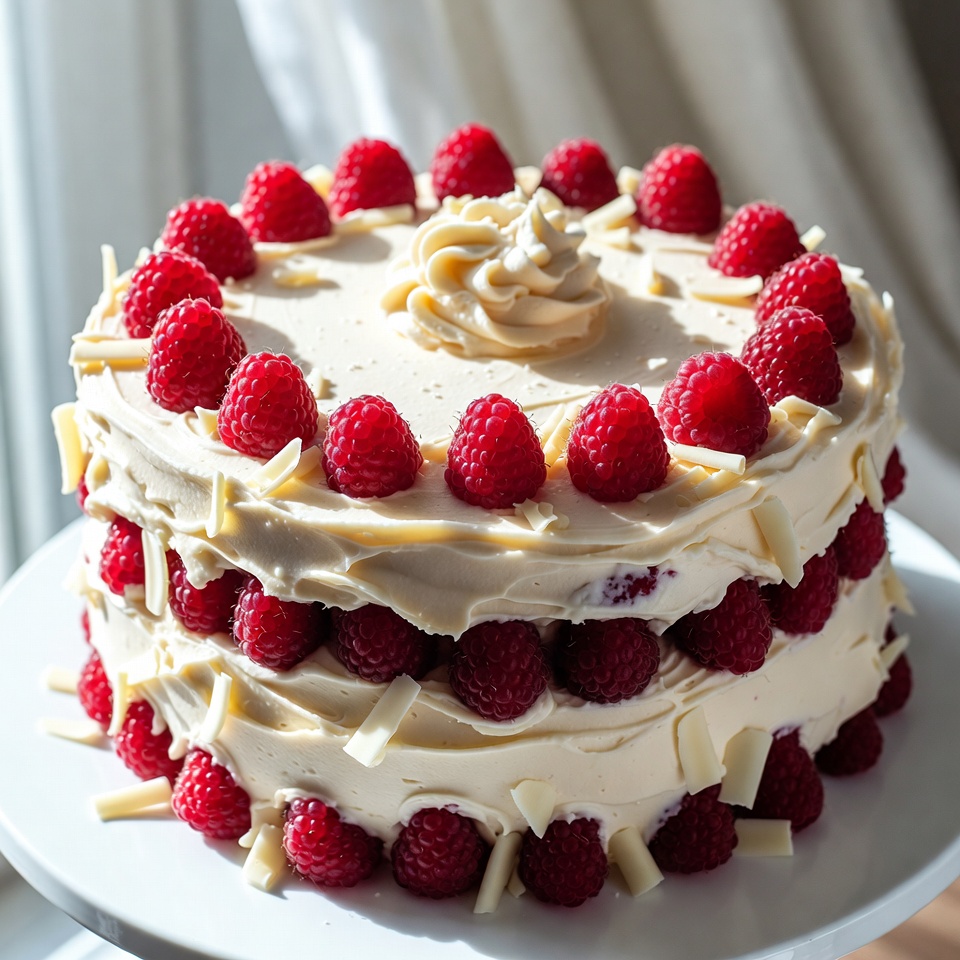 - Garnish with fresh raspberries, white chocolate curls, or keep it clean for a simple cake design. Slice and enjoy.